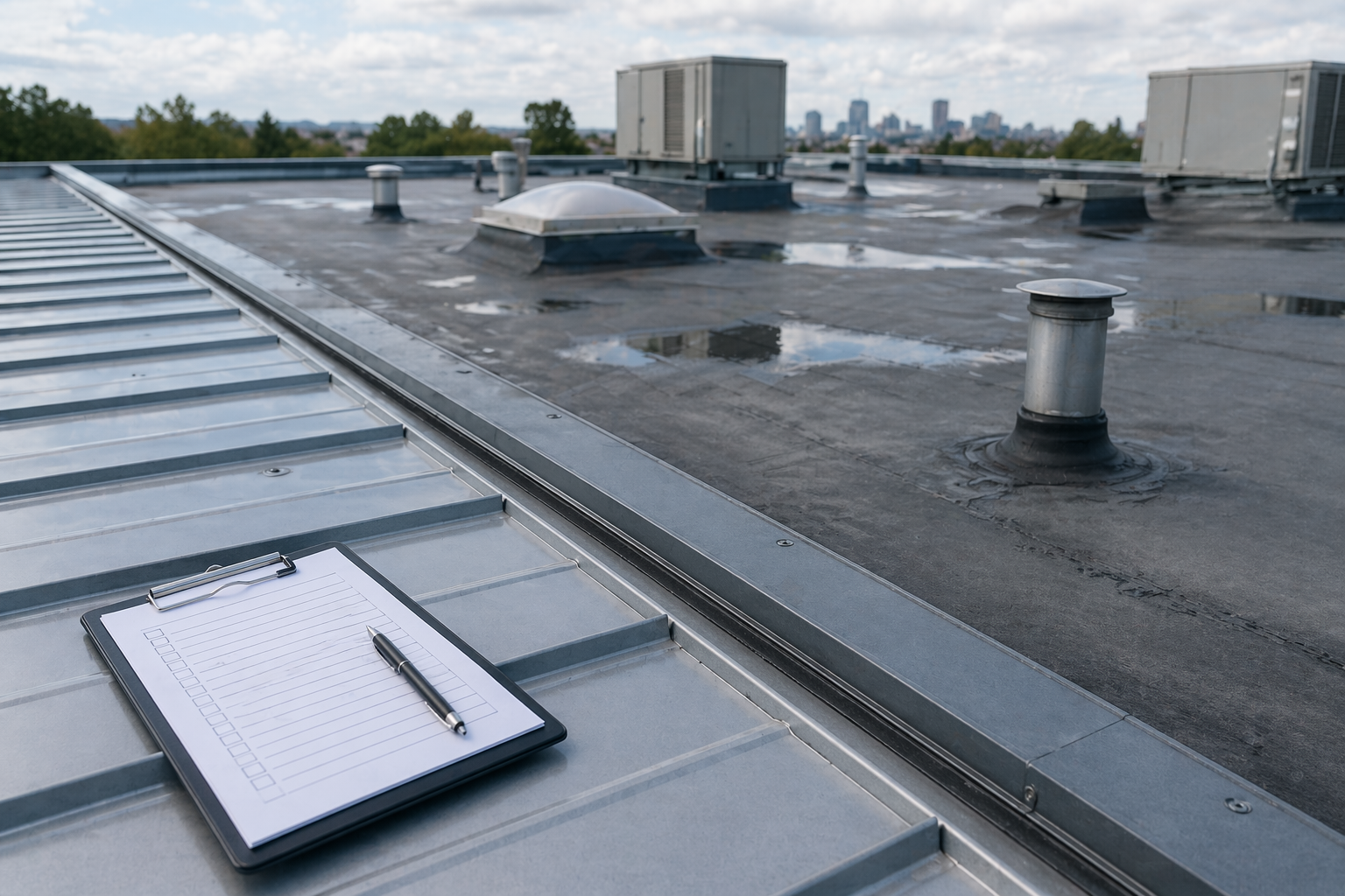 Penetrations. Every pipe, vent stack, HVAC curb, and skylight is a penetration. Each one needs a properly installed flashing collar and intact sealant. These fail quietly and are easy to overlook on a quick pass.